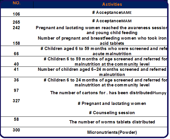 To boost Awareness the society about Ill nutrition and examination active and passive and systems referral and mechanisms tracking retarded on repayment , get up volunteers the society the healthy in a Locations targeted publish Messages Main (IYCF) / Hygiene during nutrition awareness sessions at the community and family level.